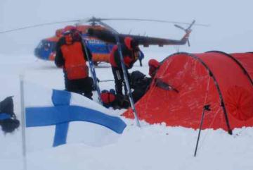 Another important task was to take blood samples for the medical research being undertaken as part of the Expedition. Then, we crawled into our sleeping bags and fell asleep. After a while, Henkku got on the blower to Station Barneo to see about our pick-up flight. The helicopter flight was soon arranged, but the timing remained somewhat open-ended. The upshot of this was that the Mi-8 chopper arrived unexpectedly, unannounced and out of the blue. Surprised out of our sleep, we had a rush on to get out of our tents and strike camp.